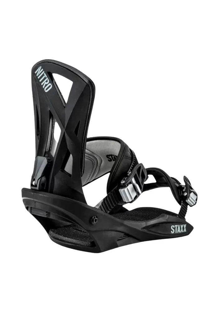The Staxx provides a friendly flexing design coupled with mountain-tested technologies at a minimum weight, with 100% focus on maximizing comfort, for effortless progression with confidence and style on and off the groomed runs. The Nitro Staxx snowboard binding provides user-friendly features and tools to help riders of all levels to accelerate through the progression curve with ease and confidence. The medium flexing A-Frame Base and Hammer Highback deliver a seamless flex and fit at a minimum weight, while the Perfect FIT Ankle Straps and EVA Dampening provide all-day comfort. The Aluminum Speedwheel Buckles and B.E.S.T. Convertible Toe Strap allow you to strap down and customize your fit to your individual boot with confidence. The Staxx was engineered to make snowboarding more comfortable to allow you to ride longer!