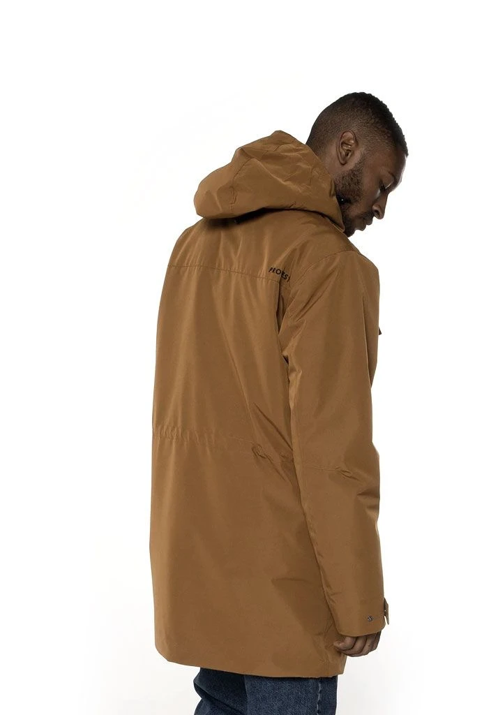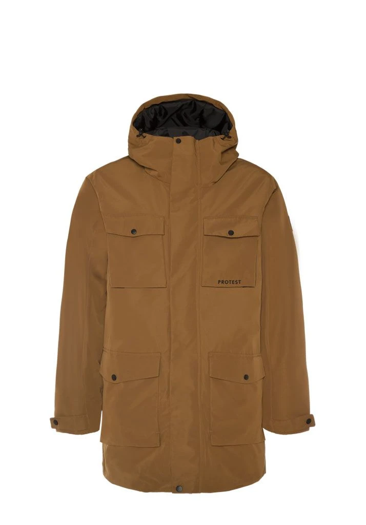 Introducing the tremendous Meltin by Protest. A jacket a little less ordinary. This longer length piece of outerwear has a relaxed fit. A primary focus for us is perfecting the functionality of a garment, so it does exactly what you need it to do. That is why workwear is a constant source of inspiration for our designers. For the Meltin, we have referenced workwear pockets. This street jacket also has 10K water resistance and 10g breathability. This basically means that while no water is getting in from the outside, moisture that builds up on the inside of the jacket is allowed to escape through the fabric. The outer fabric of this jacket is PFC-free in an effort to reduce the detrimental effect that this chemical has on our health and the environment. We use an environmentally friendly waterproofing method instead. There is a high collar and the seams are critically taped. Be ready for anything in the Meltin by Protest.